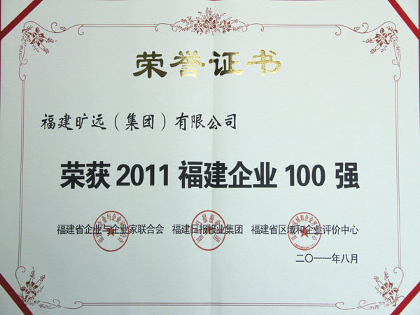 2011年08月 福建曠遠(yuǎn)集團(tuán)榮膺“2011福建企業(yè)100強(qiáng)”