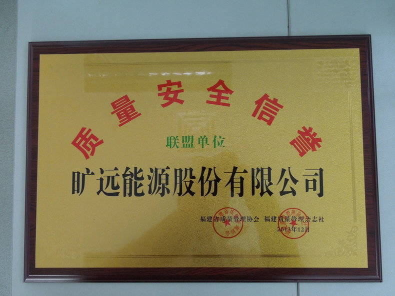 2013年12月 曠遠(yuǎn)能源被福建省質(zhì)量管理協(xié)會(huì)與福建省質(zhì)量管理雜志社評(píng)為“質(zhì)量安全信譽(yù)聯(lián)盟單位”