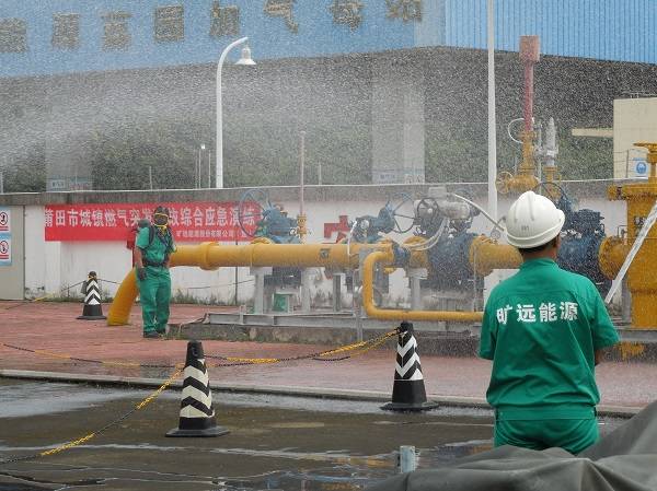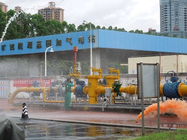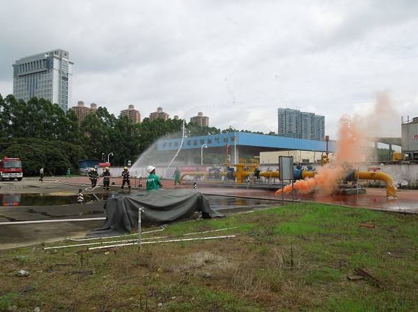 當天上午9時許,由演練總指揮副總裁黃劍鋒正式下達演練指令,演習的內容為荔園站遭到恐怖襲擊,調壓站設備壓力表遭到破壞,出現泄漏,被荔園站保安和員工發現并及時控制,封鎖現場啟動應急機制。隨后,場站人員及消防部門通過向泄漏處噴灑消防水降低現場天然氣濃度,搶險組到場后對受損管線進行切換,保證天然氣正常供給,并更換受損儀表,上午10時順利搶修完畢并恢復使用。