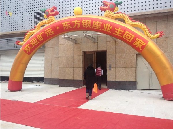交房當天,曠遠·東方銀座物業服務中心現場井然有序,喜氣洋洋,業主們都沉浸在收獲的喜悅中。銷售現場外,花柱、拱門、彩旗迎風飛舞,迎接著每一位業主的入住。