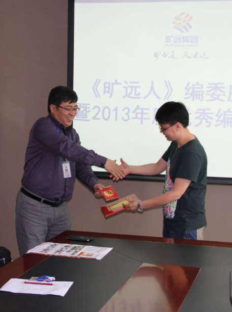 會議最后,針對在2013年度期刊建設中,表現較為突出的編委進行了表彰。其中,來自曠遠能源的謝力耘榮獲了“2013年度優秀編委”稱號,來自曠遠房地產的曾明月榮獲了“2013年度企業活動活躍分子”,副總裁姜升科先生分別為其頒發了證書及獎金,并表示祝賀。
