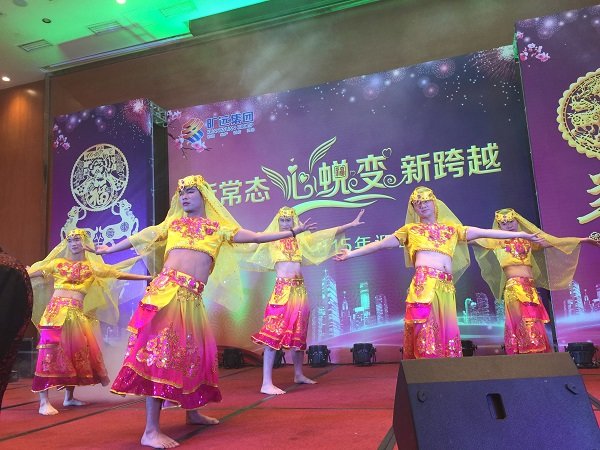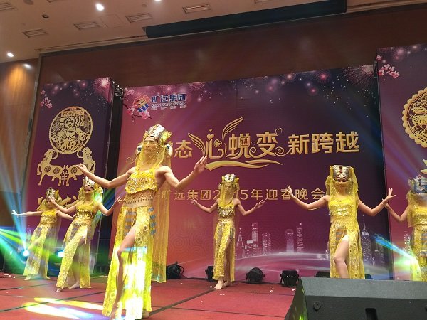 圖為曠遠集團2015年迎春晚會現場高管變裝登臺拜年
