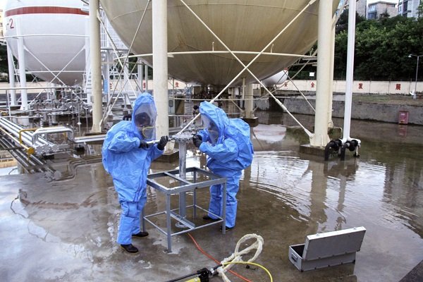 本次演練項目為: LPG1#儲罐底部出液管第一道法蘭墊片老化造成液化氣泄漏事故的應急處置。主要流程為:模擬事故發生、報警、應急啟動、人員疏散、安全警戒、消防噴淋驅散燃氣稀釋濃度、搶險堵漏及最終解除警戒等。在演練總指揮葉春總經理的指揮下,所有參演人員嚴肅認真、有條不紊地推進各個步驟,歷時一個小時后,演練圓滿完成。