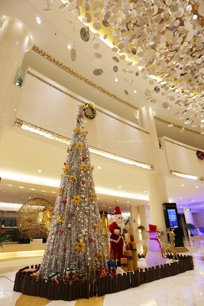 圣誕節(jié)將至,曠遠(yuǎn)錦江國際酒店內(nèi)布置了帶有濃郁圣誕色彩的裝飾,一棵5米高掛滿飾物的銀色圣誕樹矗立在大堂中央,伴隨著歡樂的圣誕歌曲,整個(gè)酒店充滿著歡慶喜悅的節(jié)日氛圍。