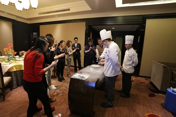 4月12日,莆田廣播電臺《1030天天美食》品鑒團走進曠遠錦江酒店,全新體驗分子美食盛宴,酒店主廚詳細介紹了分子美食的背景、知識、技術等,并現場展示了幾道經典的分子料理,讓現場這群“嘴刁”的食客也是贊不絕口,尤其是“冰汁南瓜球”,看起來類似蛋黃,咬破那層薄膜后飆出的南瓜汁瞬間充滿口腔,十分奇妙。