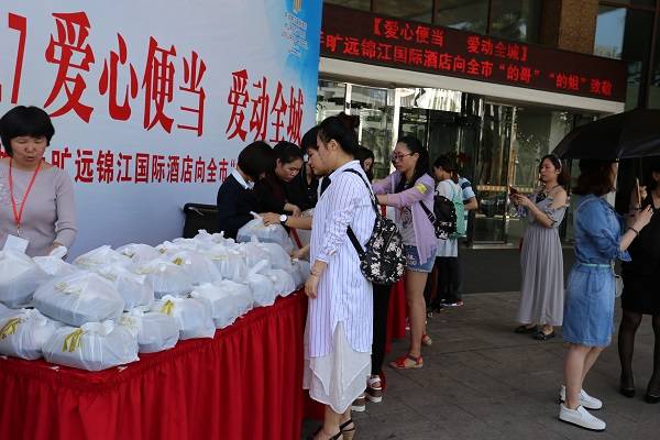 5月13日,曠遠錦江國際酒店攜手FM93.7開展“愛心便當 愛動全城”公益活動,現場免費派送200份愛心便當,為全市“的哥”、“的姐”送上一份愛的溫暖。派送的愛心午餐內有紅燒鮑魚、野生菌炒牛柳、香菇蒸土雞、大白菜炒油豆腐等,搭配營養合理。除此之外,更是為出租車師傅們準備了飲用水和紙巾,處處充滿著體貼與溫馨。