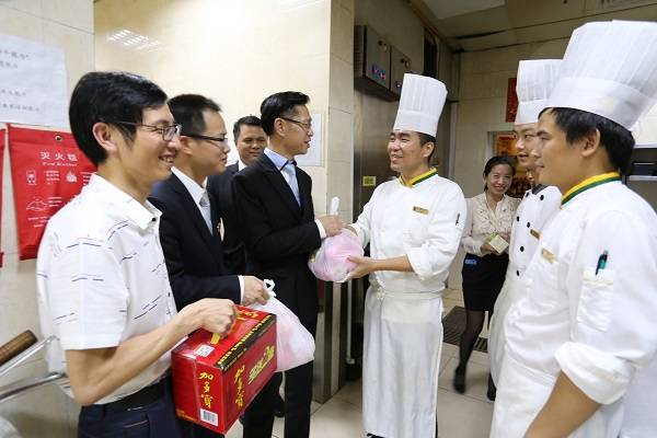 2016年8月9日,由酒店總經理王之斌及各部門負責人組成的高溫慰問小組代表集團及酒店向在酒店高溫崗位工作的員工進行慰問工作,先后至酒店洗衣房、鍋爐房、PA、西廚房、中廚房、日廚房、保安、員工食堂等高溫崗位拜訪工作人員,并為他們送去消暑慰問品,感謝員工辛勤付出,并囑咐員工高溫作業時應注意操作安全和保護措施,做好防暑降溫工作。