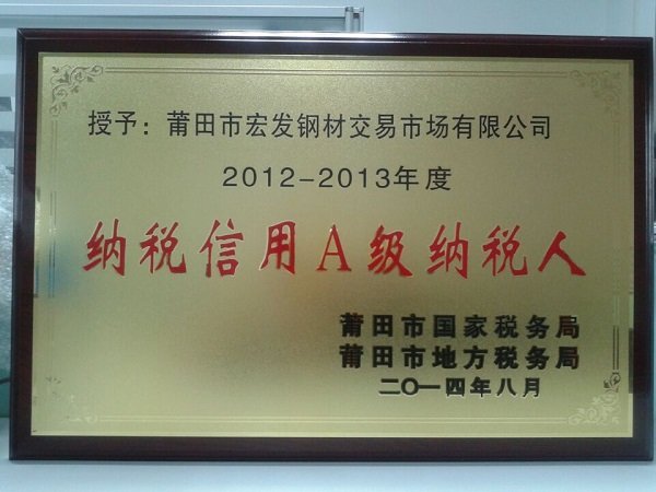 莆田宏發鋼材獲評2012-2013年度“納稅信用A級納稅人”
