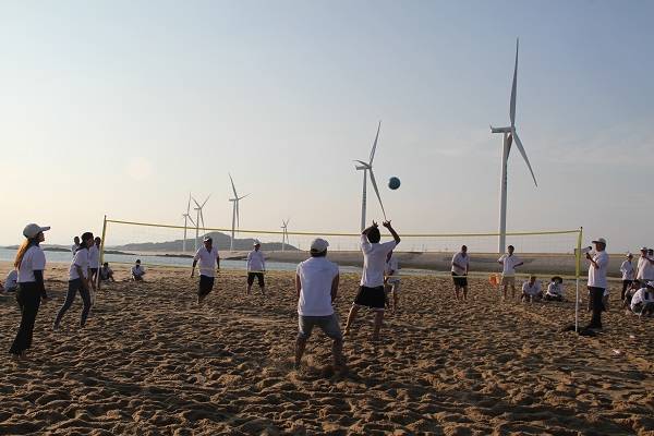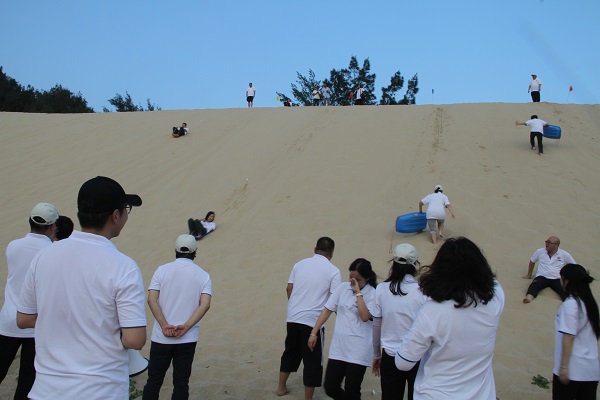 22日下午13:30,全體人員在莆田辦公樓一樓集合后,統一乘坐大巴前往石城碼頭,搭乘輪船至南日島。當天下午15:30到達南日島后,經過一番修整,全體人員即刻前往南日島皇帝山沙灘。活動首先將人員分成四組,推選出小組組長后,各隊分別為自己所在隊伍取隊名,分別為蛟龍隊、海龍隊、海神隊、風車隊。隨后,隊長帶領隊員選取副隊長,并為團隊取口號,進行了團隊風采展示。各隊儼然進入了“戰斗”狀態,迫不及待地趕往沙丘開展滑沙比賽。