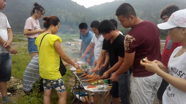 經過一番體能訓練后,燒烤作為本次拓展訓練的最后一個環節隆重登場。所有人員分工有序:女生洗菜、備料;男生積極主動地架起爐具,升炭火,所謂好事多磨,大家又是煽,又是吹,在煙霧繚繞中,炭火終于燃燒起來。幾個有經驗的燒烤高手,更是不辭辛勞地為大家服務,程總與郭總也一起加入到服務隊伍中。不到三小時,大伙兒便陸陸續續把一堆烤肉、蔬菜“消滅”了。