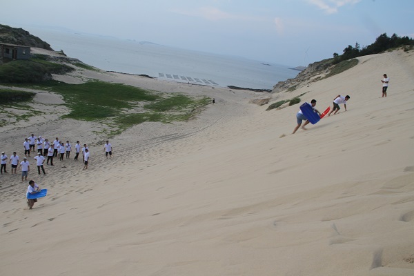 22日下午13:30,全體人員在莆田辦公樓一樓集合后,統一乘坐大巴前往石城碼頭,搭乘輪船至南日島。當天下午15:30到達南日島后,經過一番修整,全體人員即刻前往南日島皇帝山沙灘。活動首先將人員分成四組,推選出小組組長后,各隊分別為自己所在隊伍取隊名,分別為蛟龍隊、海龍隊、海神隊、風車隊。隨后,隊長帶領隊員選取副隊長,并為團隊取口號,進行了團隊風采展示。各隊儼然進入了“戰斗”狀態,迫不及待地趕往沙丘開展滑沙比賽。