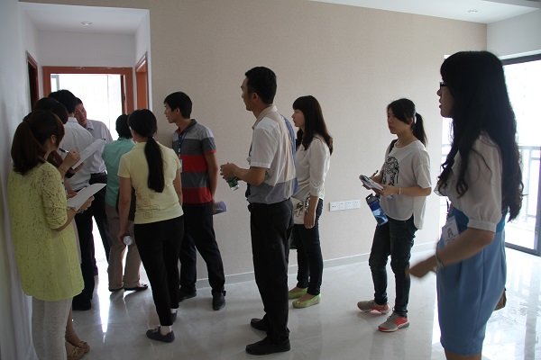 2014年6月4日上午10:30,由集團總裁辦牽頭組織集團相關(guān)部門對曠遠東方銀座3#樓精裝修初驗及室外景觀復(fù)驗。在集團副總裁王光忠的帶領(lǐng)下,由董事長助理兼審計監(jiān)察部總監(jiān)熊燕芳,集團總裁辦副主任王瑜,集團采購管理中心總監(jiān)李險峰,集團成本管控中心總監(jiān)張培英及其部門相關(guān)人員,房地產(chǎn)公司成員組成的驗收組,主要針對3#樓精裝修初驗及室外景觀進行復(fù)驗。 驗收組一開始先對室外景觀進行了復(fù)查,王副總裁提出嚴格按照初驗提出的22條整改清單核查,總裁辦副主任王瑜、成控中心及其他驗收組成員一一進行盤點,驗收結(jié)果顯示22條整改清單基本整改完畢。但在復(fù)查過程中,驗收組發(fā)現(xiàn)了一個新問題——花池路沿石被撞開裂,就此問題施工單位當(dāng)天及時給予了修復(fù)。 室外景觀驗收完畢后,驗收組隨即對3#樓精裝修進行了初驗。3#樓精裝修總共228套,針對工作量大、時間緊,王副總裁提議中午加班加點查驗完成,提議每種戶型必須查驗并且抽查不低于總套數(shù)50%。驗收組重點對5樓、7樓、19樓及21樓進行核查,核查過程中,發(fā)現(xiàn)絕大部分問題都是通病,如陰陽角不直、局部墻紙空鼓、涂料表面粗糙等。王副總裁在現(xiàn)場要求嚴格按照二合一樣板房施工標(biāo)準(zhǔn)修補整改,并帶驗收組一并參觀了二合一樣板房,提出需嚴格按照樣板房標(biāo)準(zhǔn)整改。 現(xiàn)場驗收完畢后,王副總裁針對本次景觀工程復(fù)驗、3#樓精裝修初驗所存在的問題,提出了限時整改的要求。 圖為驗收組現(xiàn)場驗收 圖為驗收組現(xiàn)場驗收 圖為驗收組現(xiàn)場驗收 圖為驗收組現(xiàn)場驗收 圖為驗收組現(xiàn)場驗收 圖為驗收組現(xiàn)場驗收