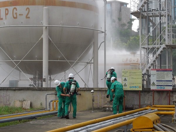 2014年6月18日下午15:30,曠遠能源股份有限公司在生產部氣源廠開展關于LPG儲罐法蘭泄漏應急處理演練。