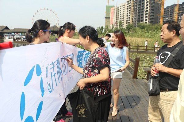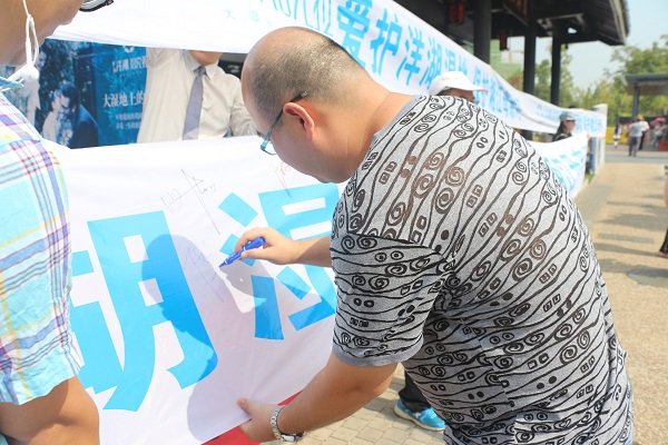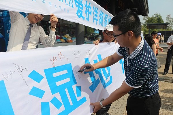 圖為市民在”愛護洋湖濕地,保護湘江母親河”橫幅上簽名