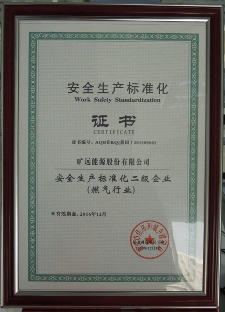 曠遠能源獲“安全生產標準化二級企業”稱號