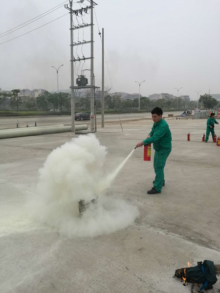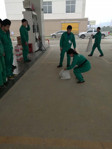 本次演練分為四部分,分別為:安全知識灌輸并傳達安監(jiān)局文件精神、崗位技能培訓、車輛著火應急演練、消防器材使用。主要內容為,第一,結合縣安監(jiān)局要求進行安全知識灌輸,特別對常見的安全問題及汽油打桶等新的安全要求進行灌輸;第二,在加油島開展崗位操作技能演練,主要對車輛引導手勢、客戶加油前中后的口號、消防石棉毯的使用等方面技能進行實際操作;第三,開展車輛著火應急演練,其中演練分為三組,每組4個人,演練假設用戶車輛冒煙,隨后加油員收加油槍鳴笛呼叫,場站人員聽到呼叫第一時間合力將車輛推出加油站安全距離,再進行輪流滅火步驟;第四,在商業(yè)樓最左側進行消防器材使用實操,首先站長對滅火器及石棉毯的使用進行詳細講解,再由每個加油員輪番進行實操演練。