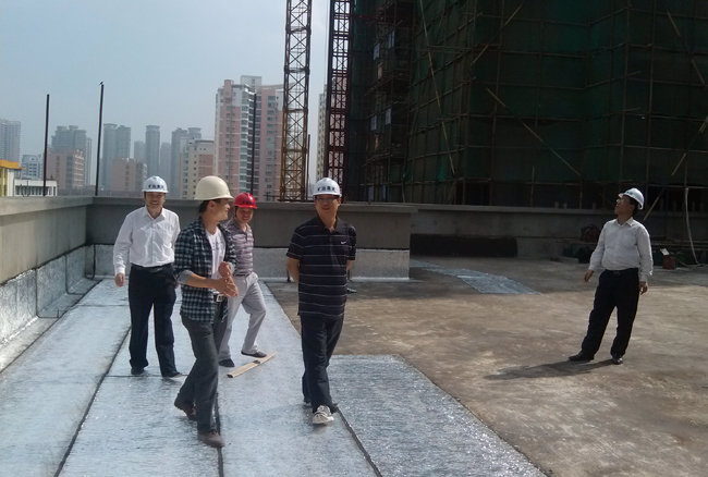 王子林董事長一行先后視察了正在施工的2號樓裙樓卷材防水屋面、項目周邊道路景觀配套設施以及整體工程的施工進度、質量、安全等情況。在檢查屋面工程時,王董事長詳細詢問了現場技術人員關于屋面防水層的施工工藝標準、選用防水卷材材料的品種、性能、厚度、搭接情況及屋面周邊反口、排水口等細部節點做法,并逐一認真聽取了現場技術人員的介紹,王董事長要求技術人員在施工過程中嚴格按照相關規范標準、施工方案及工藝標準要求,嚴把工程施工過程質量關,確保屋面今后不漏水、不滲水。在視察項目周邊配套設施時,王董事長聽取了華桂清總經理對曠遠·東方銀座項目小區整體及周邊景觀道路的規劃藍圖、景觀及相關配套設施做法的匯報。王董事長對項目的整體施工進度及其他各項工作給予了肯定,同時也對房地產公司提出了更高的要求,他表示房地產事業應重質量、抓安全、講效益,以精品工程贏得社會的認可,從而進一步提升企業品牌形象。