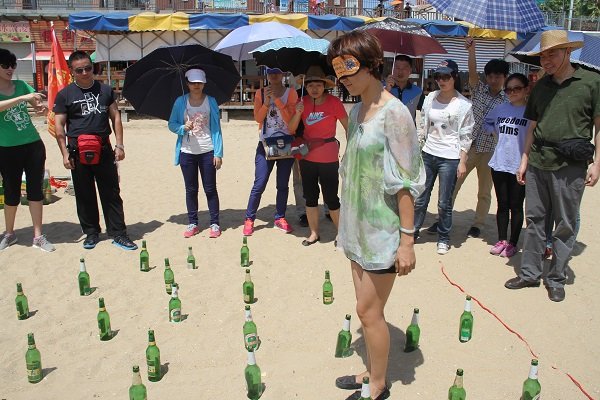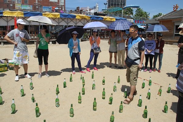圖為袋鼠跳項目中落后小組成員吹瓶